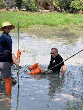 grows water chestnuts and were invited to help. Donning waders and long gloves I